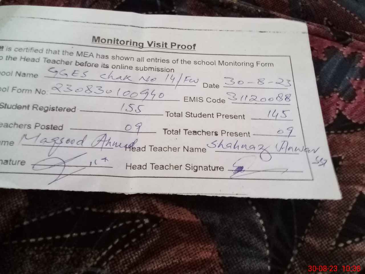 | Attendance Register | Head Teacher | MEA with School | Visit Proof |