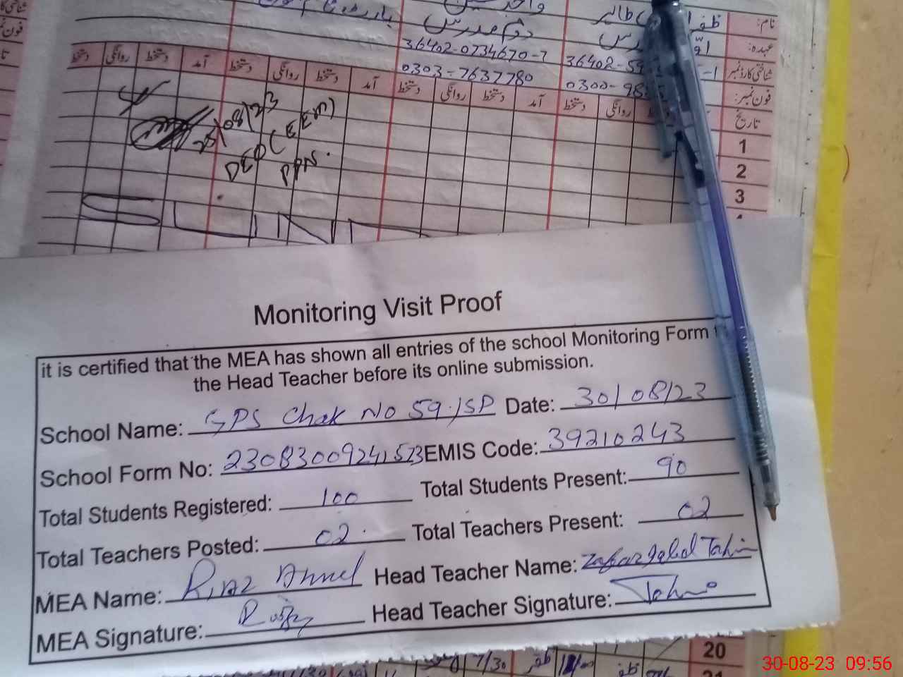 | Attendance Register | Head Teacher | MEA with School | Visit Proof |