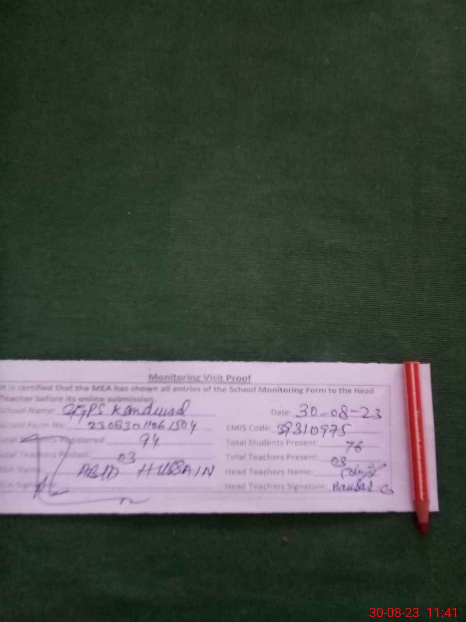 | Attendance Register | Head Teacher | MEA with School | Visit Proof |