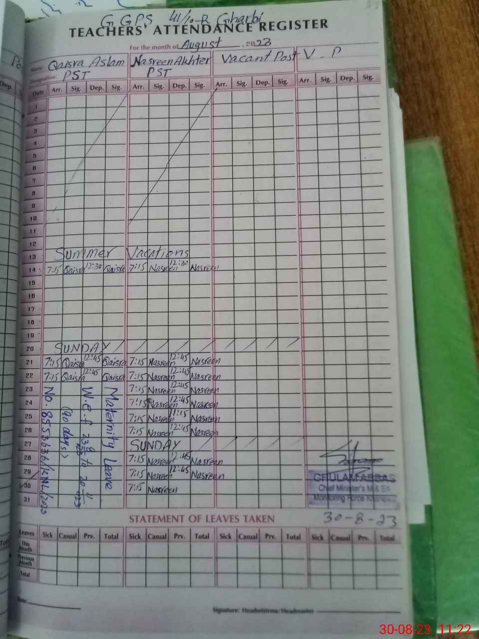 | 36**** | Qa**** As**** | PST | Regular | 0 | 0 | 0 | 0 | 0 | 0 | 0 | 0 | 0 | Maternity |