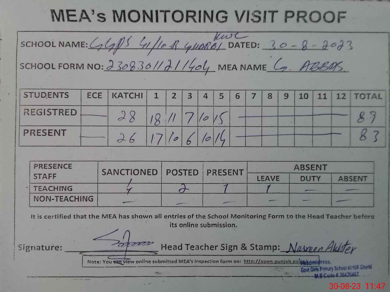 | Attendance Register | Head Teacher | MEA with School | Visit Proof |