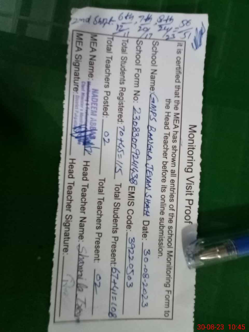 | Certified that this School was Inspected by the Undersigned MEA/DMO Today and the Information Stated Above is as Per Record. | |||||