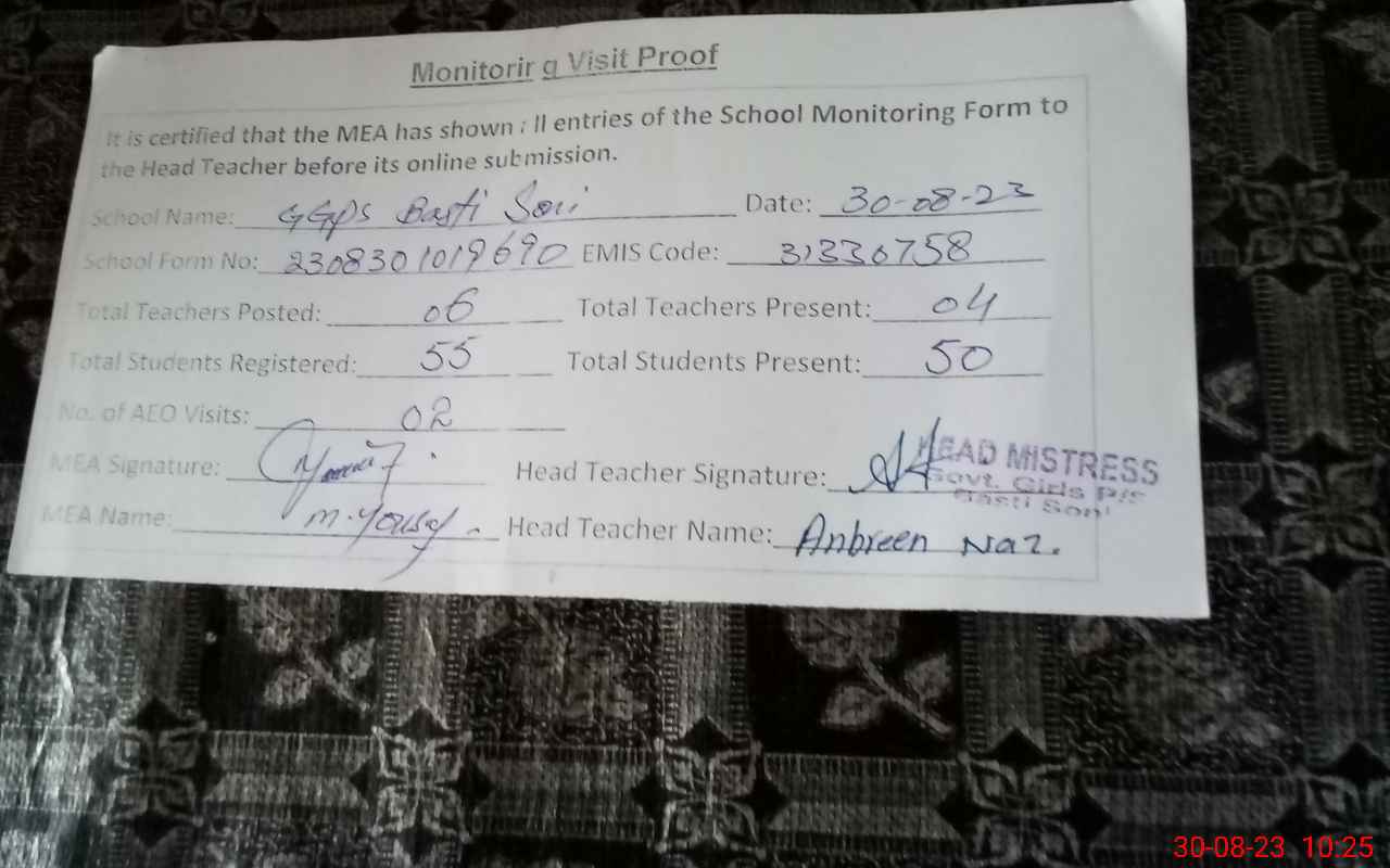 | Certified that this School was Inspected by the Undersigned MEA/DMO Today and the Information Stated Above is as Per Record. | |||||
