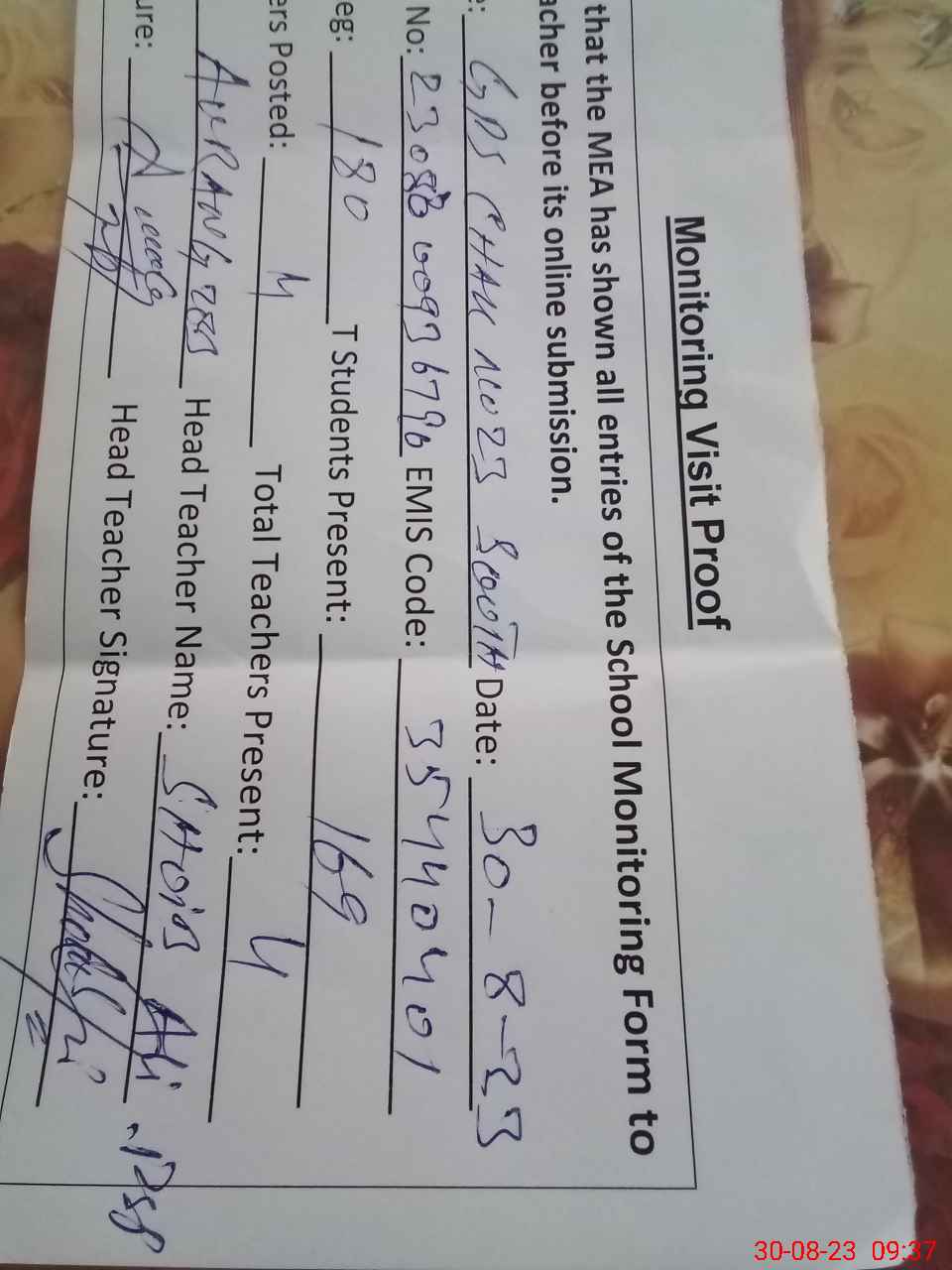 | Attendance Register | Head Teacher | MEA with School | Visit Proof |