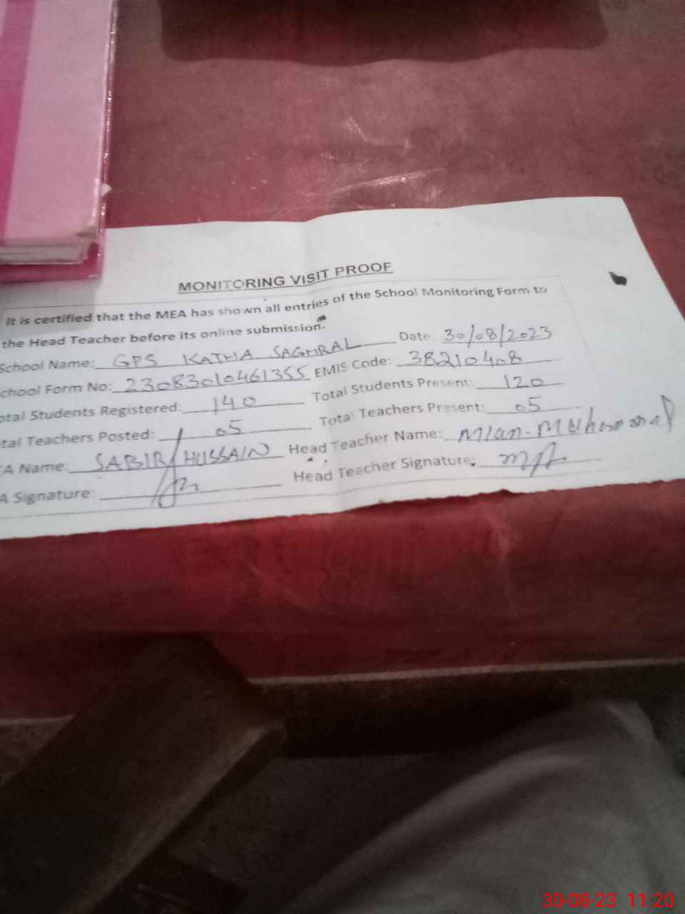 | Attendance Register | Head Teacher | MEA with School | Visit Proof |