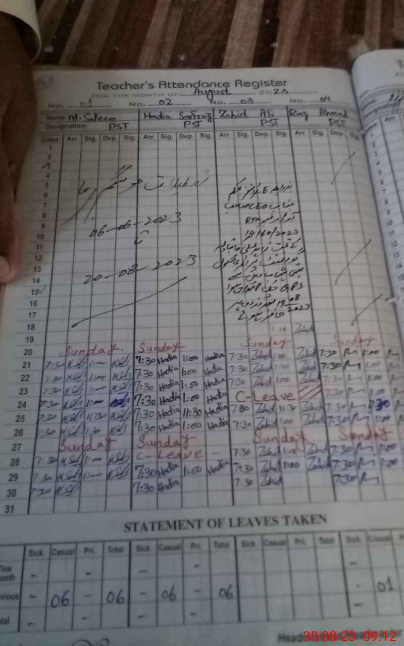 | Remarks (Use Separate Page if Required): PST Zahid Ali posted to this school wef 19 august 2023 but not yet updated on sis | |||||