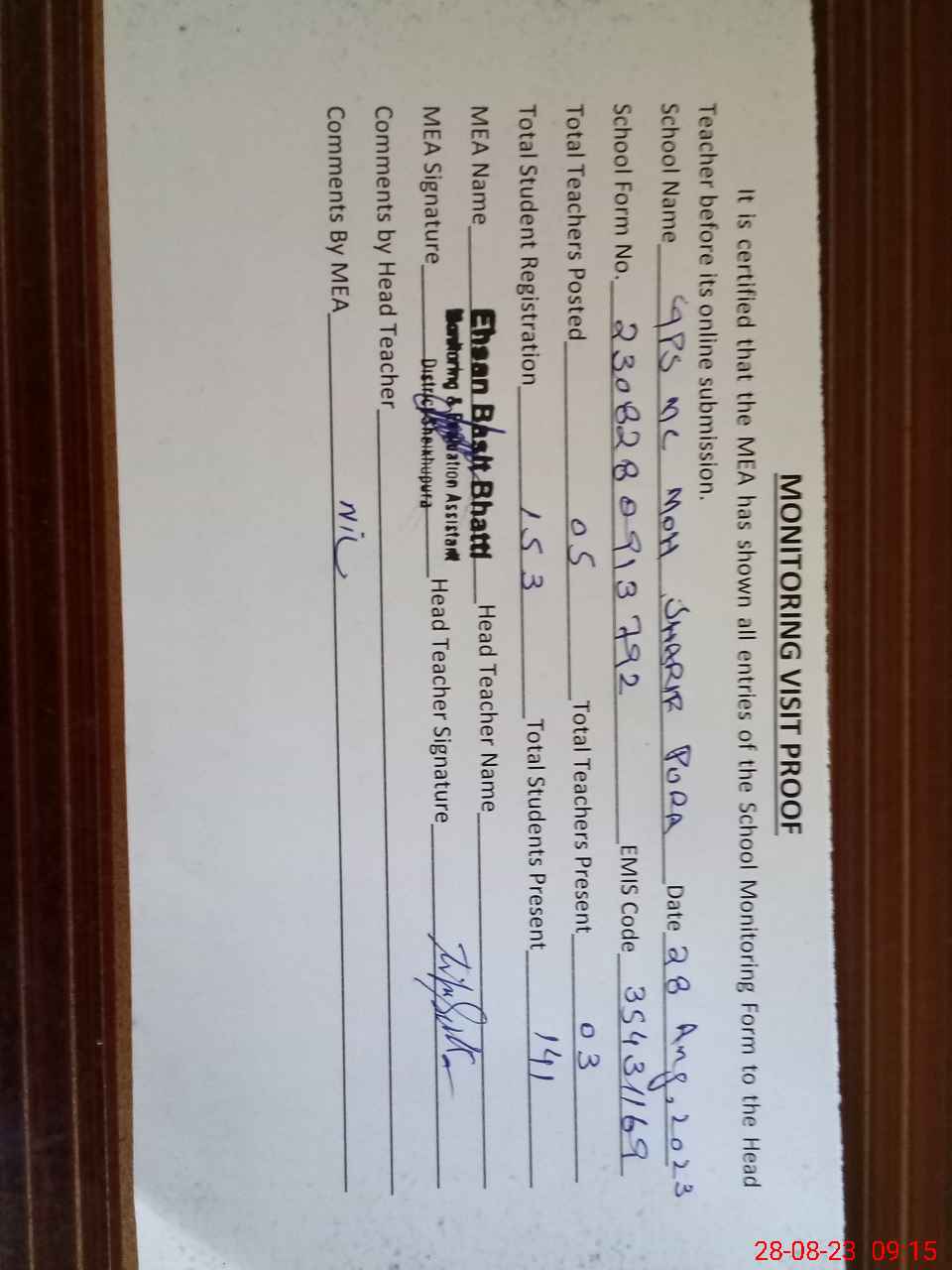 | EMIS Code: 35431169 | Name of School: GPS MC MOHALLAH SHARIF PURA | |||