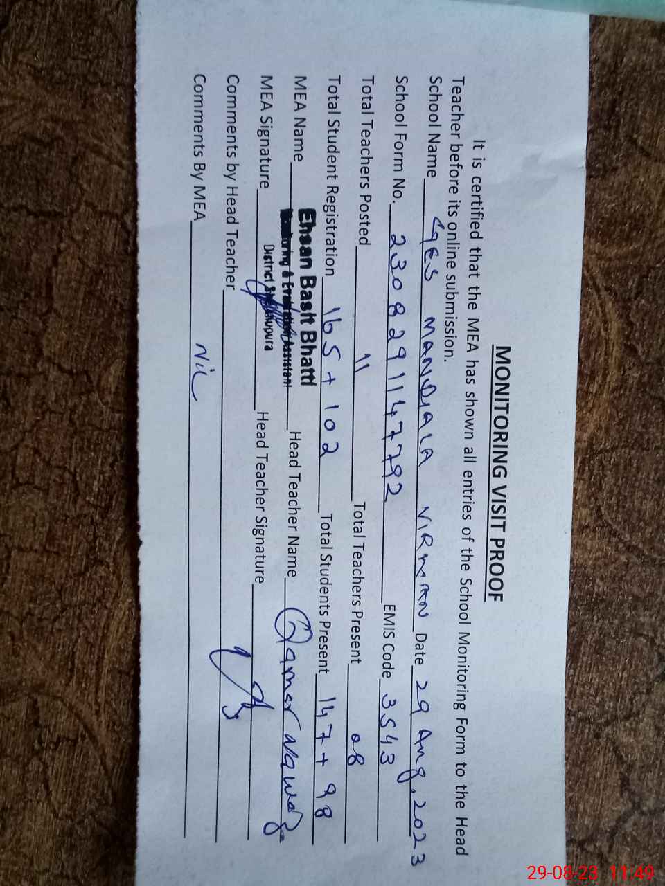 | Certified that this School was Inspected by the Undersigned MEA/DMO Today and the Information Stated Above is as Per Record. | |||||