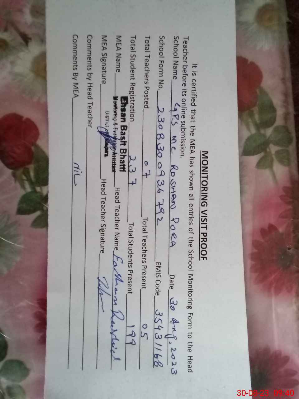 | EMIS Code: 35431168 | Name of School: GPS MC ROSHAN PURA | |||