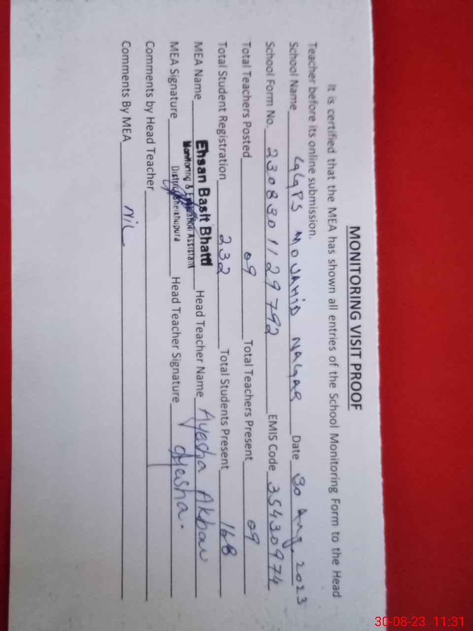 | Attendance Register | Head Teacher | MEA with School | Visit Proof |