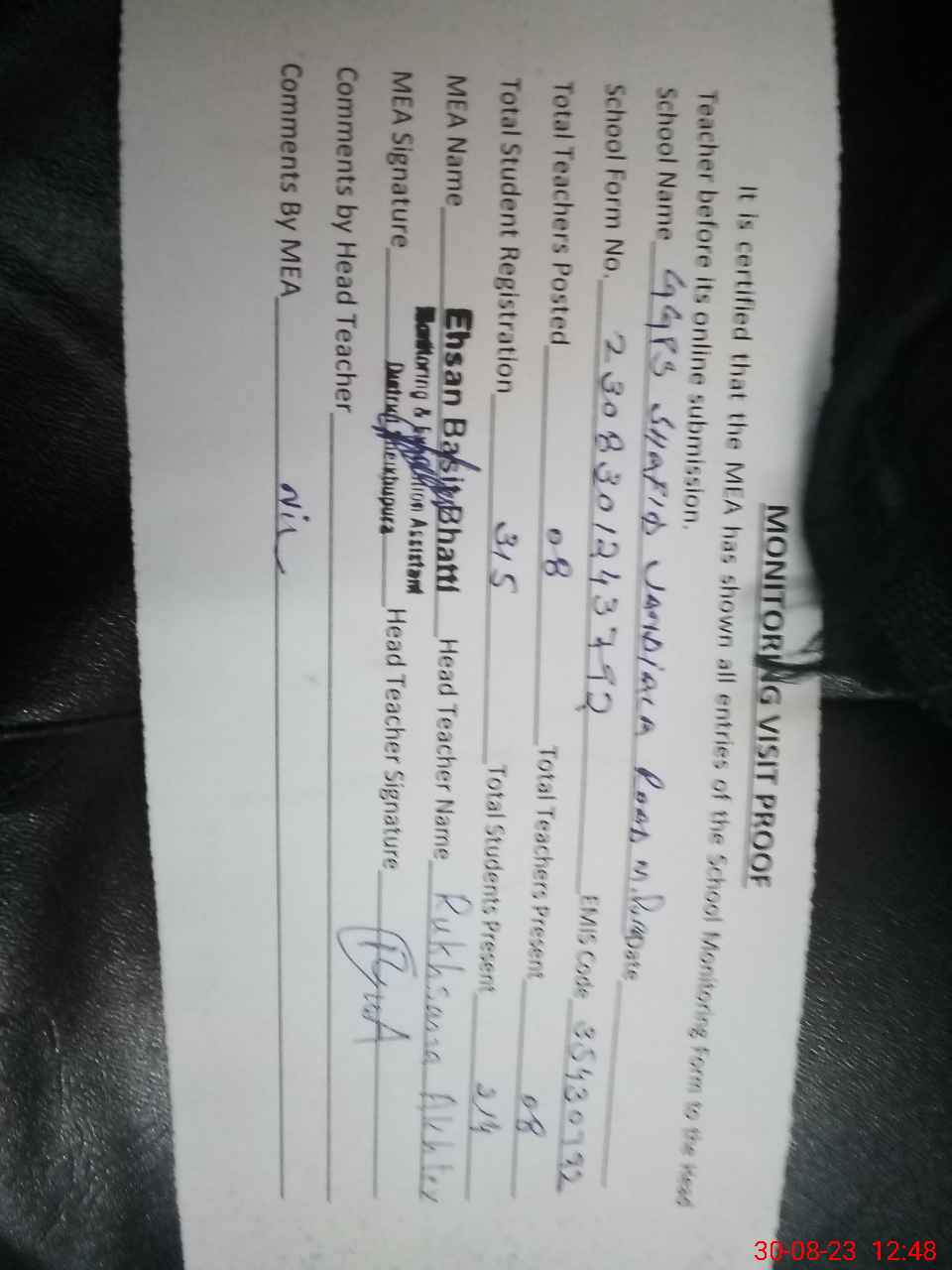 | Attendance Register | Head Teacher | MEA with School | Visit Proof |