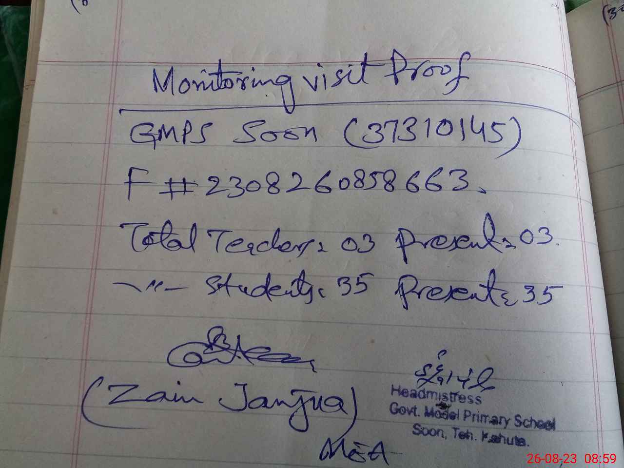 | Attendance Register | Head Teacher | MEA with School | Visit Proof |
