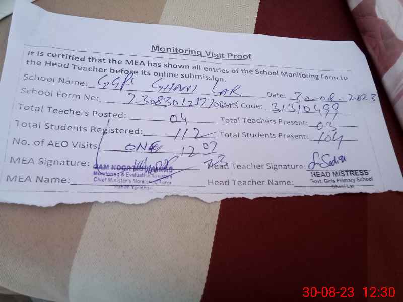 | EMIS Code: 31310499 | Name of School: GGPS GHANI LAR | |||