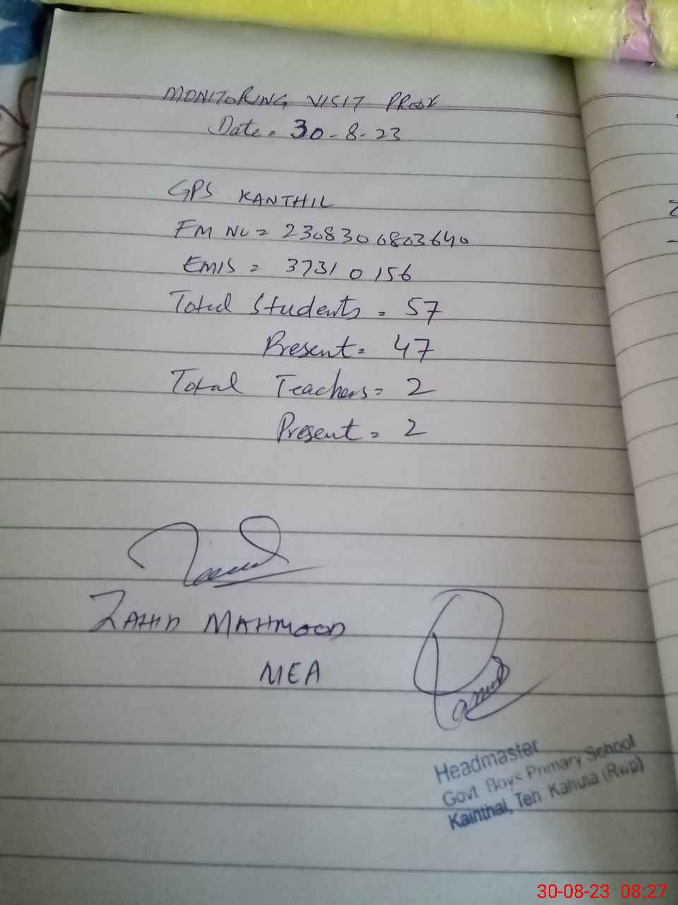| Attendance Register | Head Teacher | MEA with School | Visit Proof |