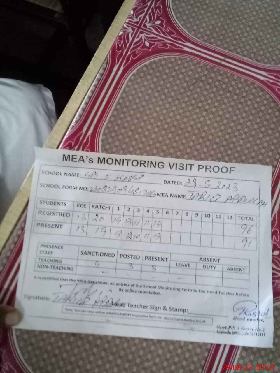 | Attendance Register | Head Teacher | MEA with School | Visit Proof |