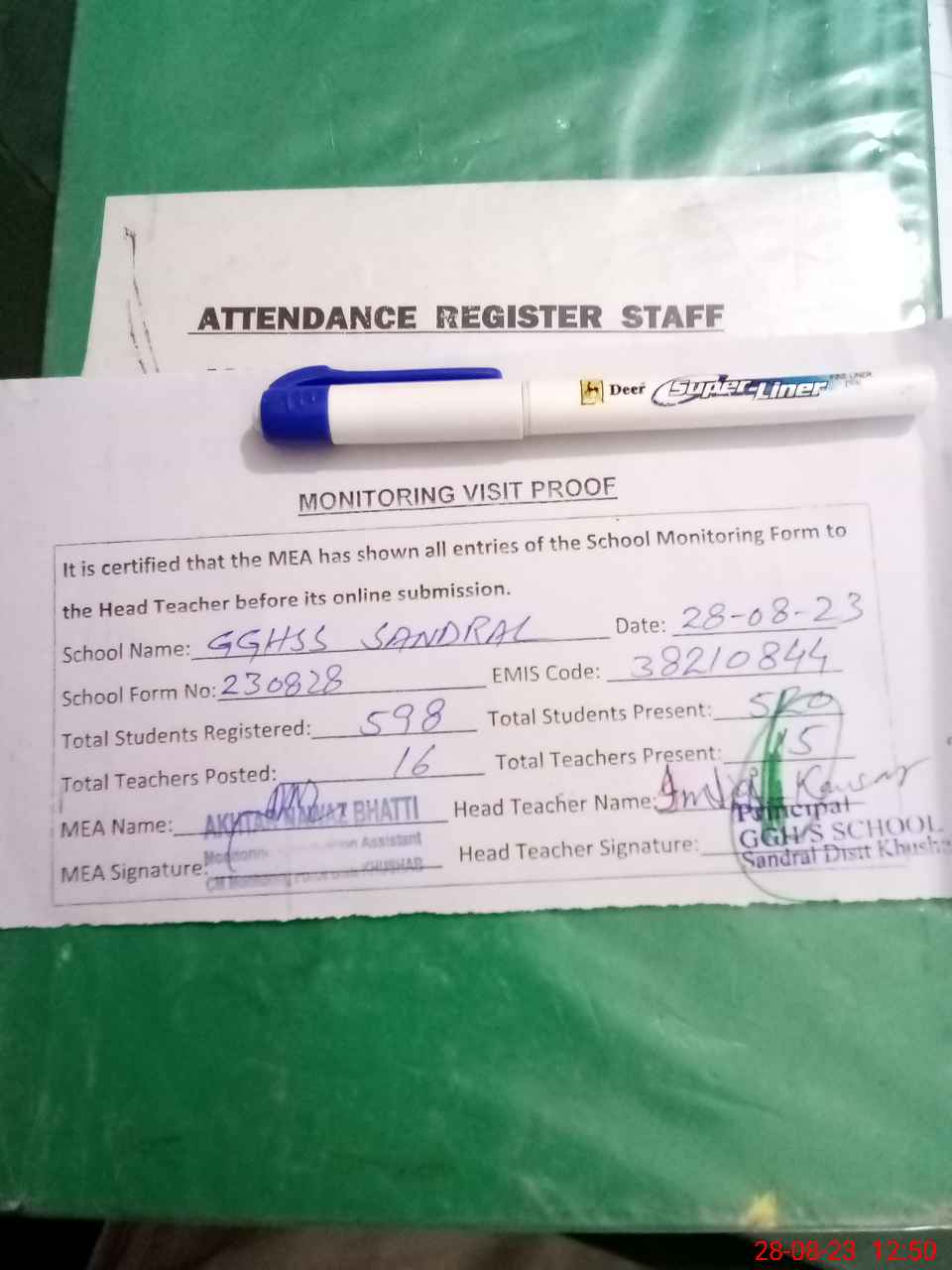 | Attendance Register | Head Teacher | MEA with School | Visit Proof |