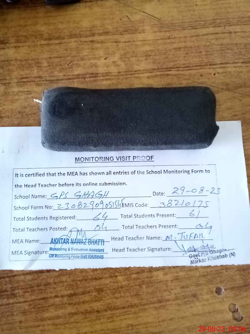| Attendance Register | Head Teacher | MEA with School | Visit Proof |