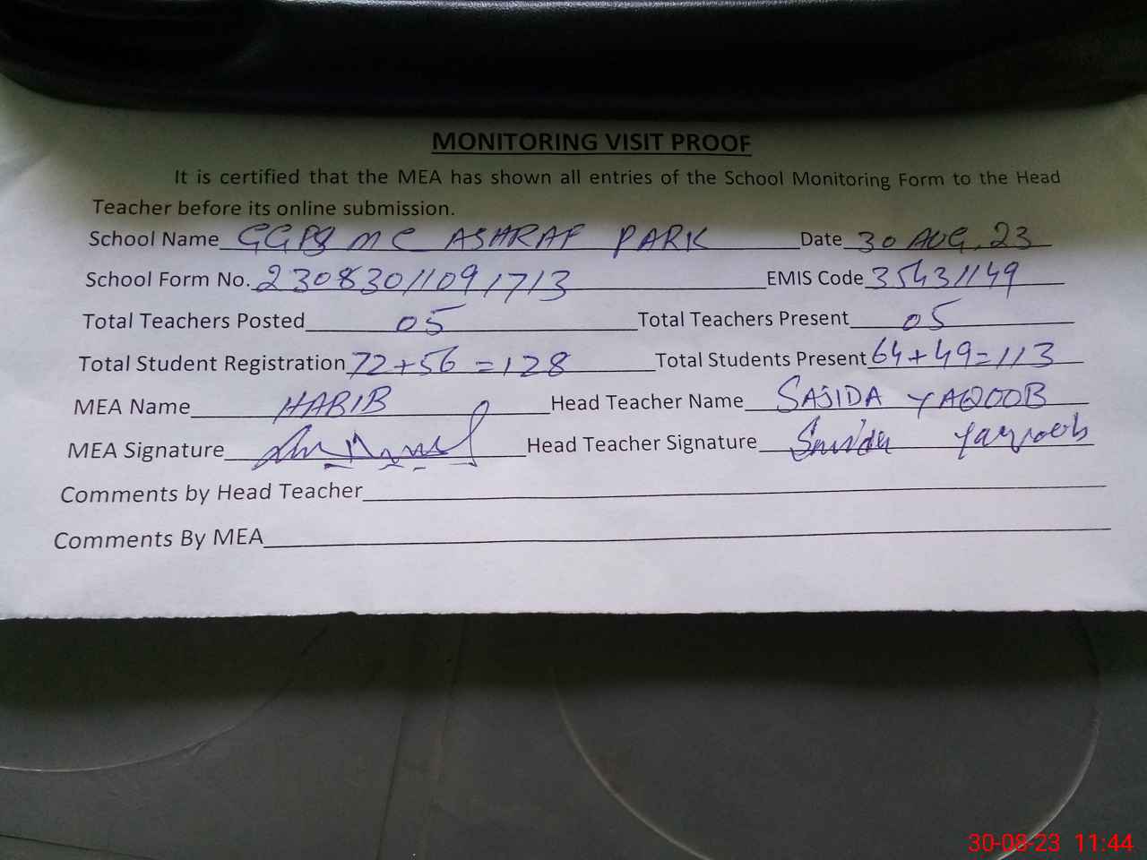 | Attendance Register | Head Teacher | MEA with School | Visit Proof |
