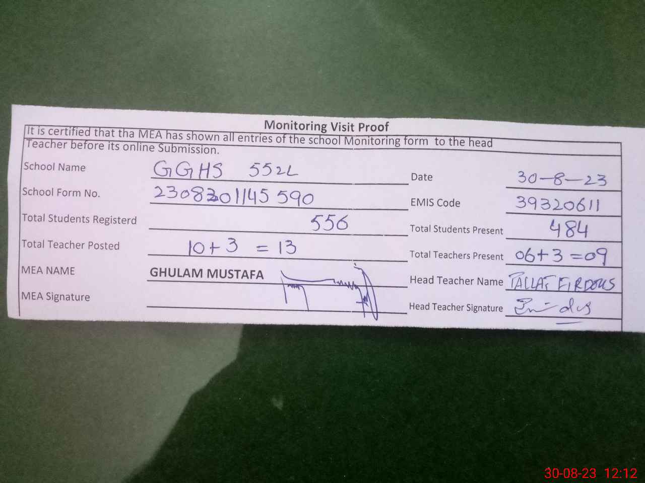 | Remarks (Use Separate Page if Required): Students list for on line attendance found contrary to available record at school Following three teachers are on the posting strength but their names still not updated in the teaching staff list Kindly add their names accordingly Further these 03 teachers found present on duty 1 Farhat Jahan PST 2 Tasnim Kausar PST 3 Sadaf Munir PST | |||||