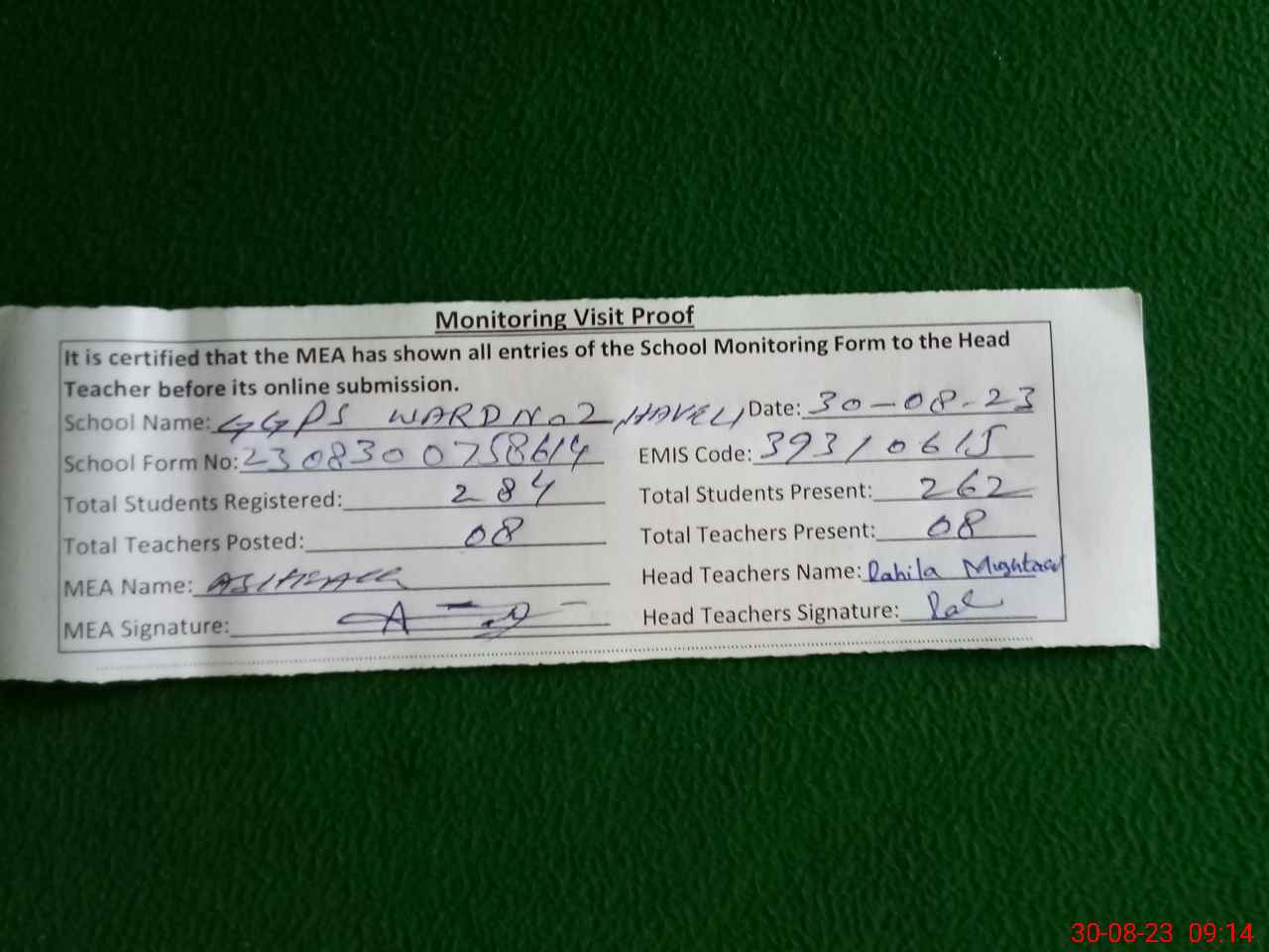 | Attendance Register | Head Teacher | MEA with School | Visit Proof |