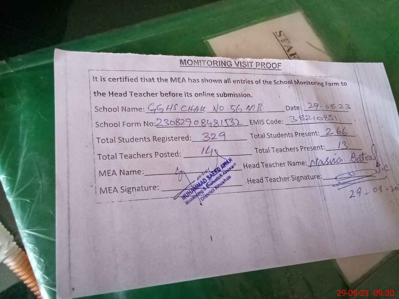 | EMIS Code: 38210851 | Name of School: GGHS CHAK NO. 56 MB | |||