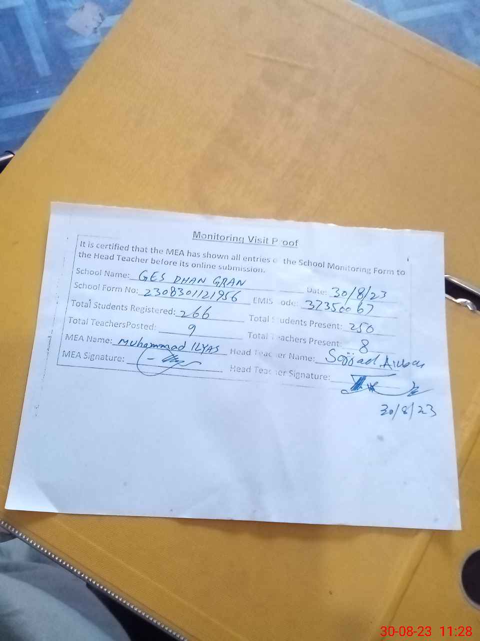 | Attendance Register | Head Teacher | MEA with School | Visit Proof |