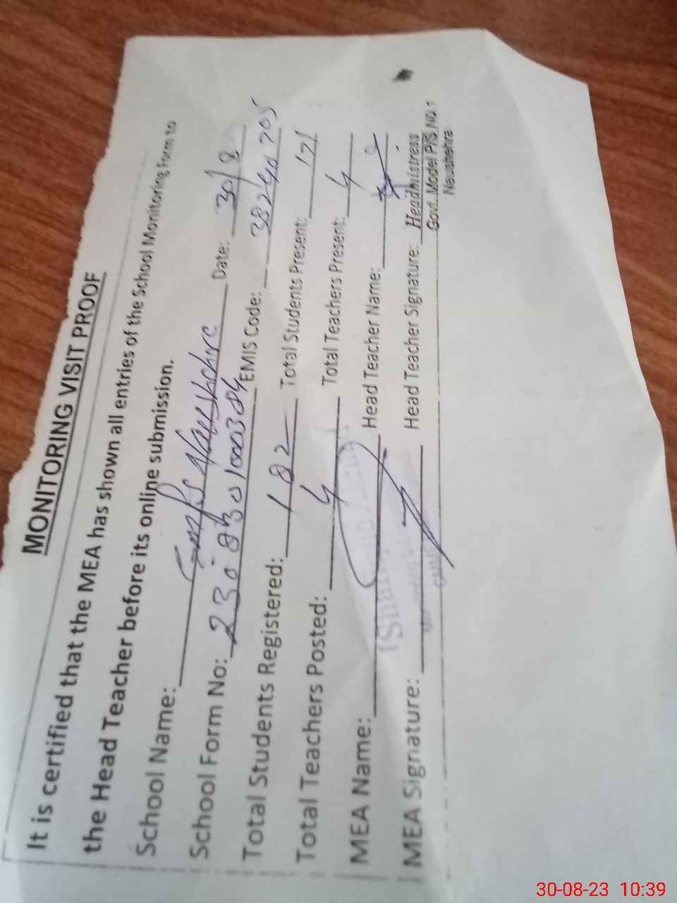 | Attendance Register | Head Teacher | MEA with School | Visit Proof |