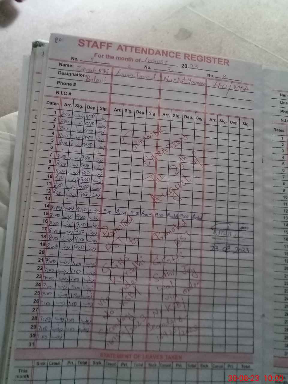 | CNIC | Full Name | Designation | R/C | Absence During Last Calender Month |