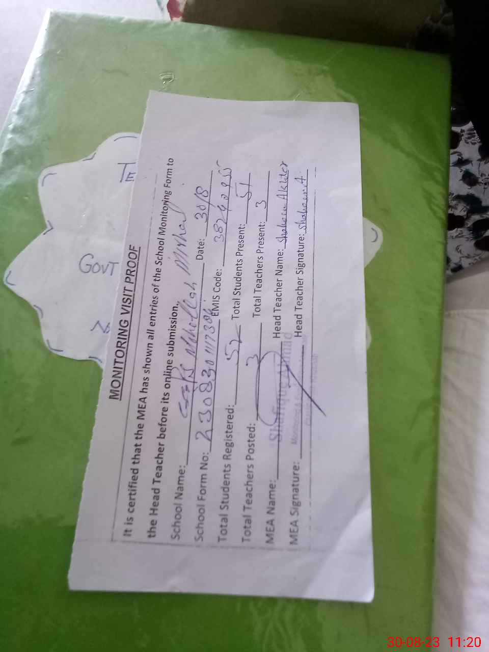 | Attendance Register | Head Teacher | MEA with School | Visit Proof |