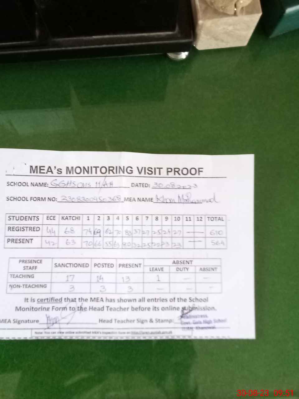 | Monitoring Date: 30-08-2023 | Start Time: 30-08-2023 09:16 AM | End Time: 30-08-2023 09:53 AM | Name of MEA: Kh**** Mu**** (S**** 05**** | |