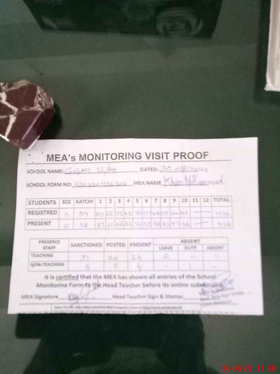 | Attendance Register | Head Teacher | MEA with School | Visit Proof |