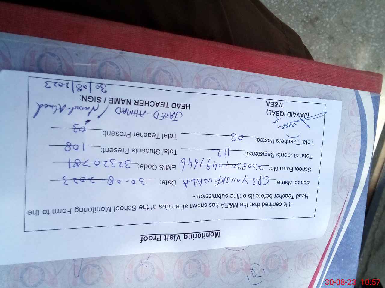 | Attendance Register | Head Teacher | MEA with School | Visit Proof |