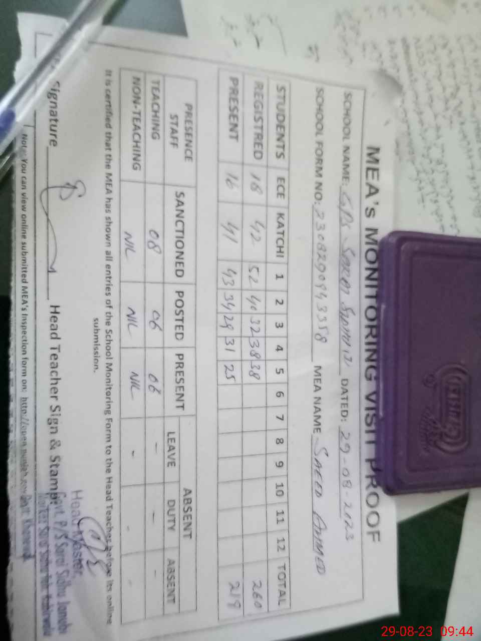 | Attendance Register | Head Teacher | MEA with School | Visit Proof |