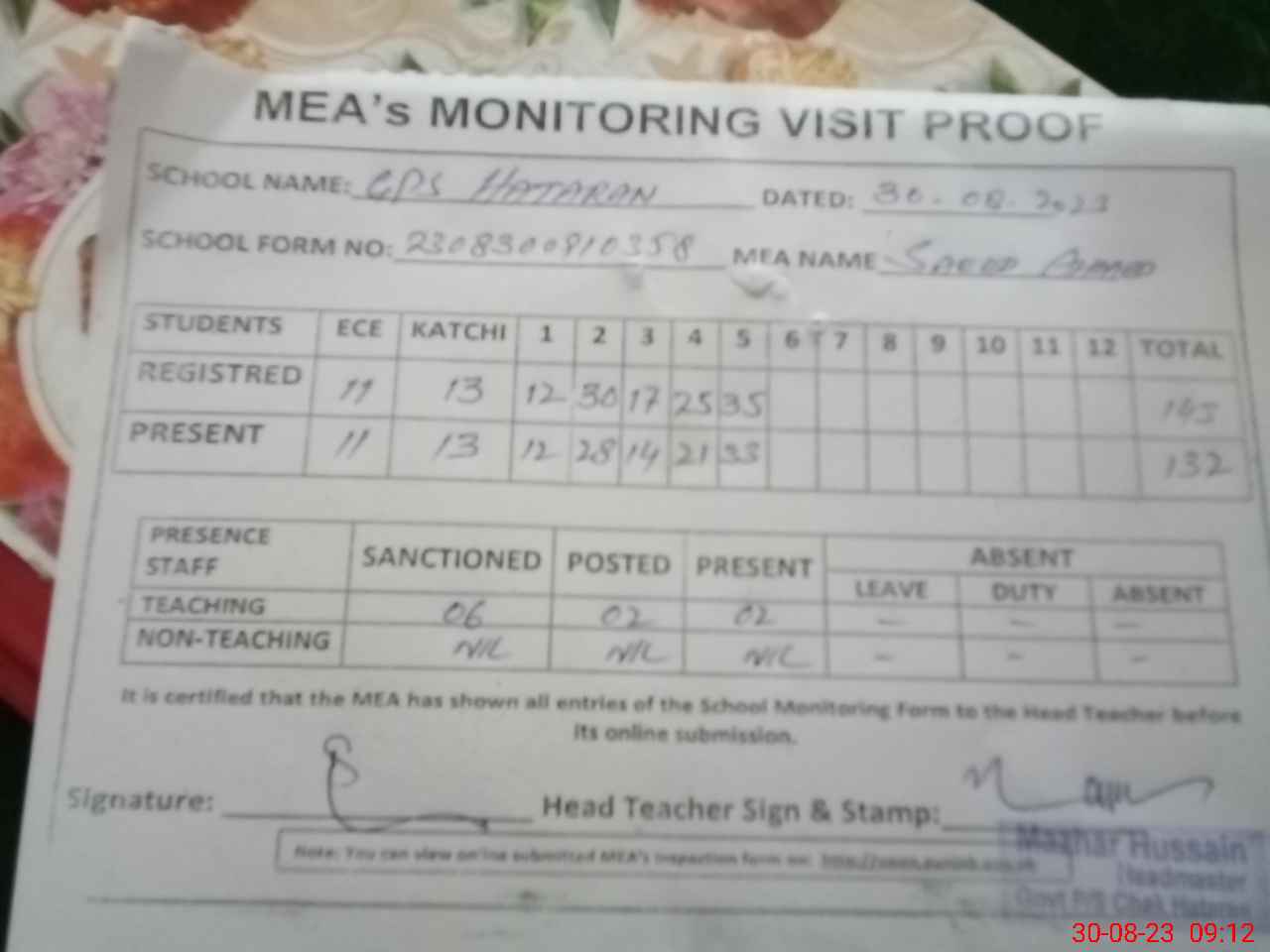 | Attendance Register | Head Teacher | MEA with School | Visit Proof |