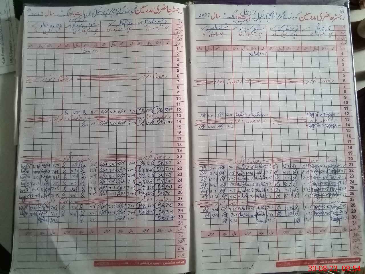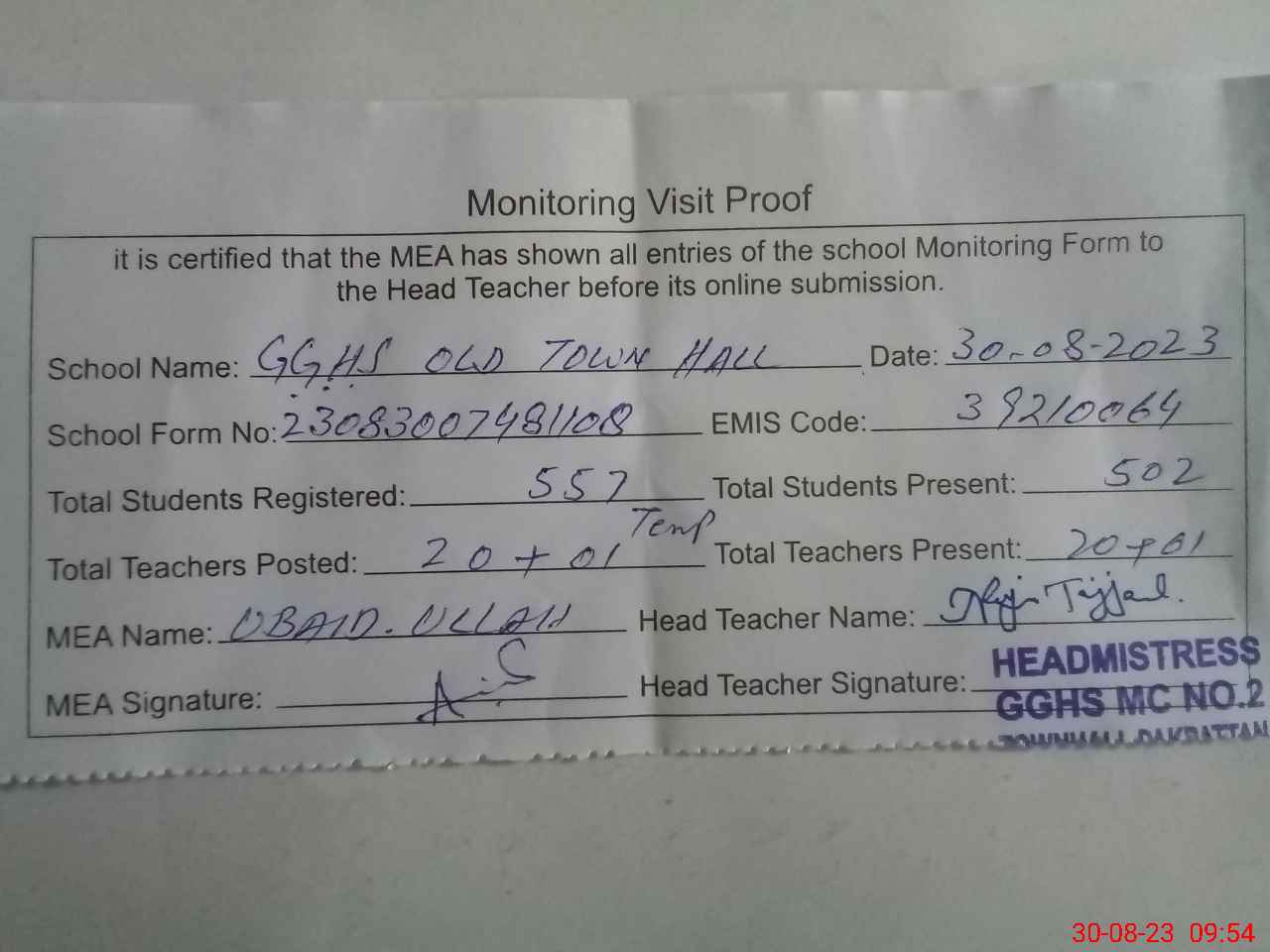 | Attendance Register | Head Teacher | MEA with School | Visit Proof |