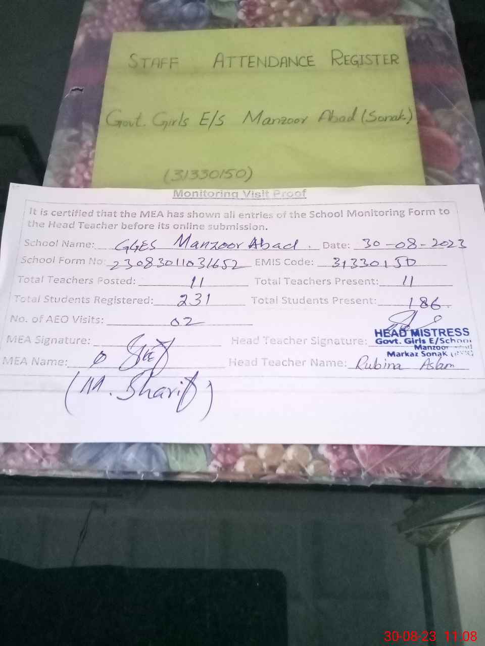 | Attendance Register | Head Teacher | MEA with School | Visit Proof |