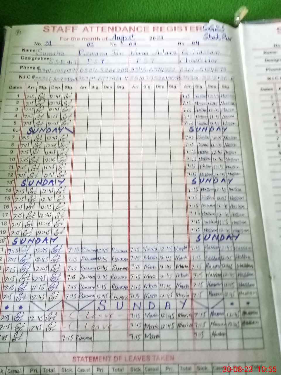 | CNIC | Full Name | Designation | R/C | Absence During Last Calender Month |