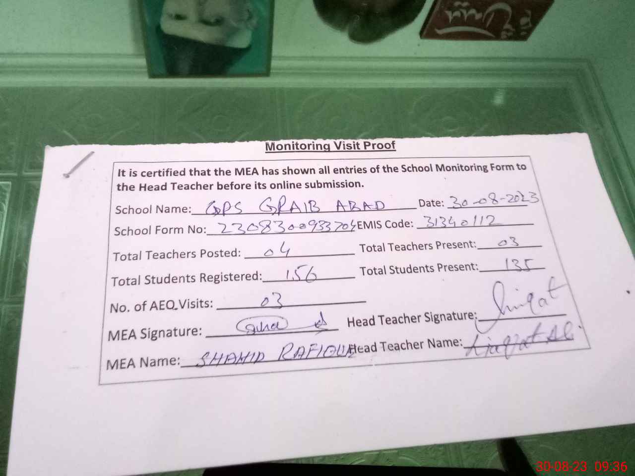| Attendance Register | Head Teacher | MEA with School | Visit Proof |