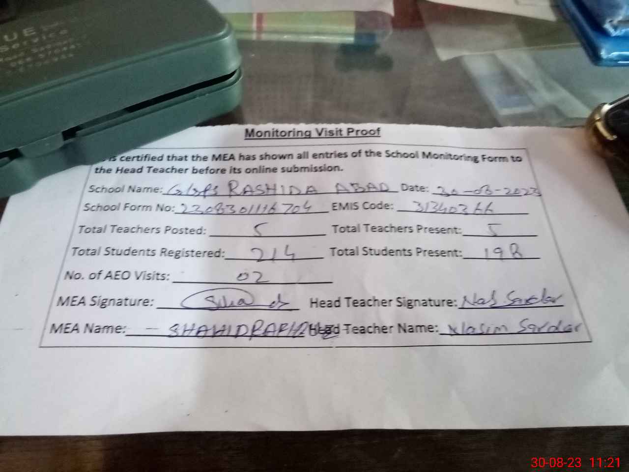 | Attendance Register | Head Teacher | MEA with School | Visit Proof |