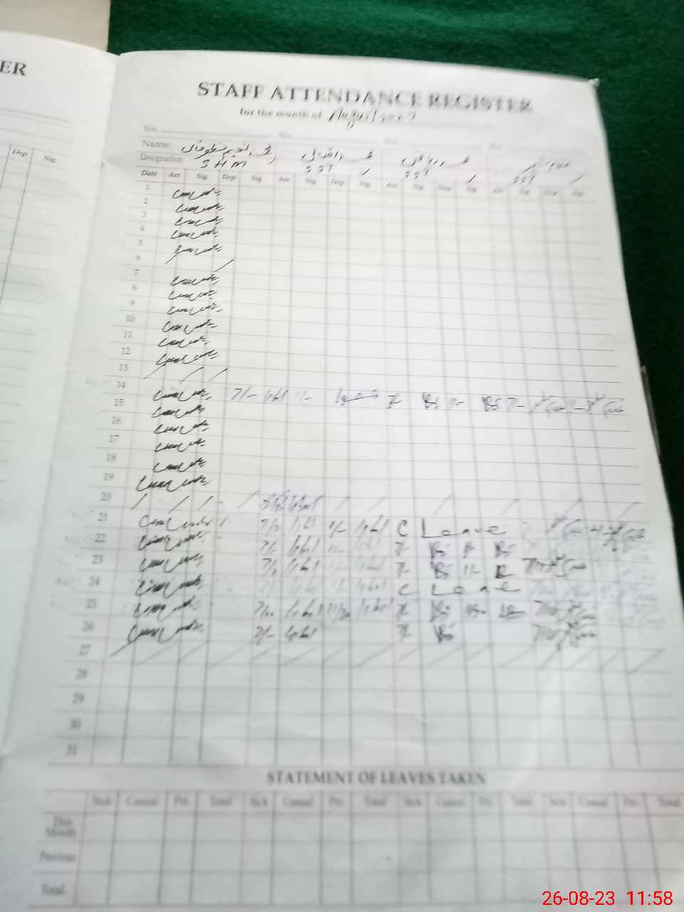 | CNIC | Full Name | Designation | R/C | Absence During Last Calender Month |