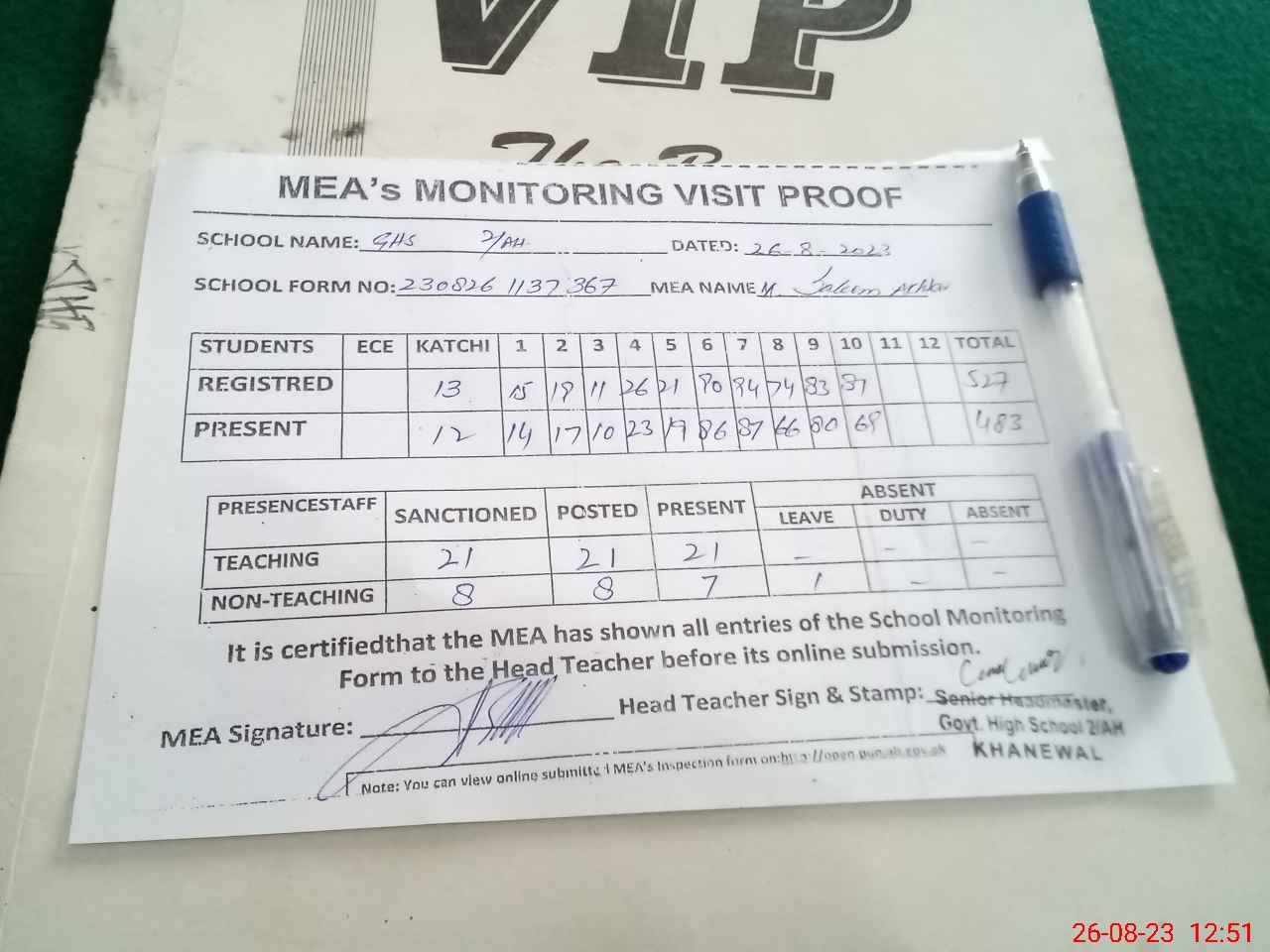 | Attendance Register | Head Teacher | MEA with School | Visit Proof |