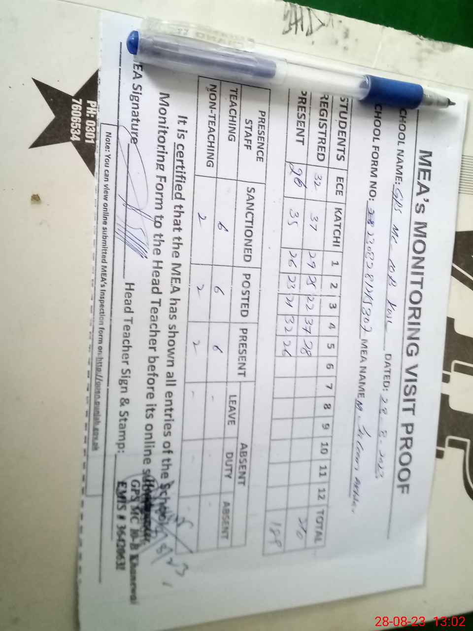 | Attendance Register | Head Teacher | MEA with School | Visit Proof |