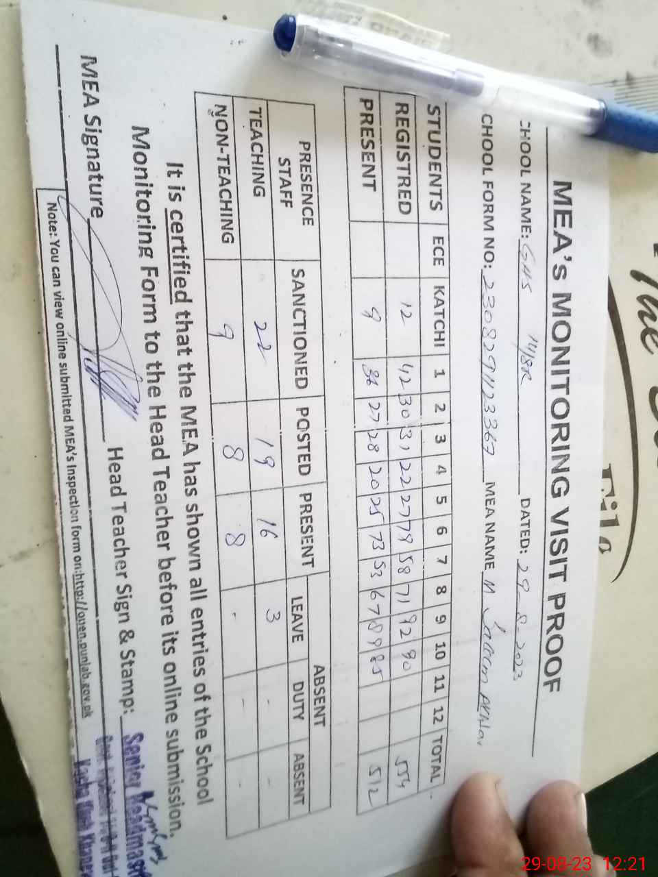 | Attendance Register | Head Teacher | MEA with School | Visit Proof |