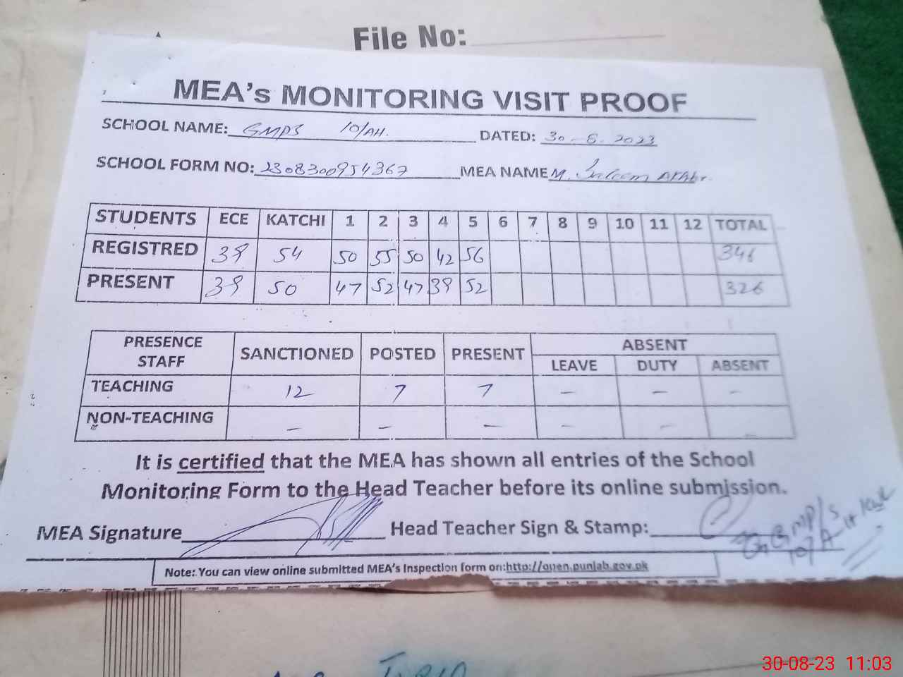 | Attendance Register | Head Teacher | MEA with School | Visit Proof |