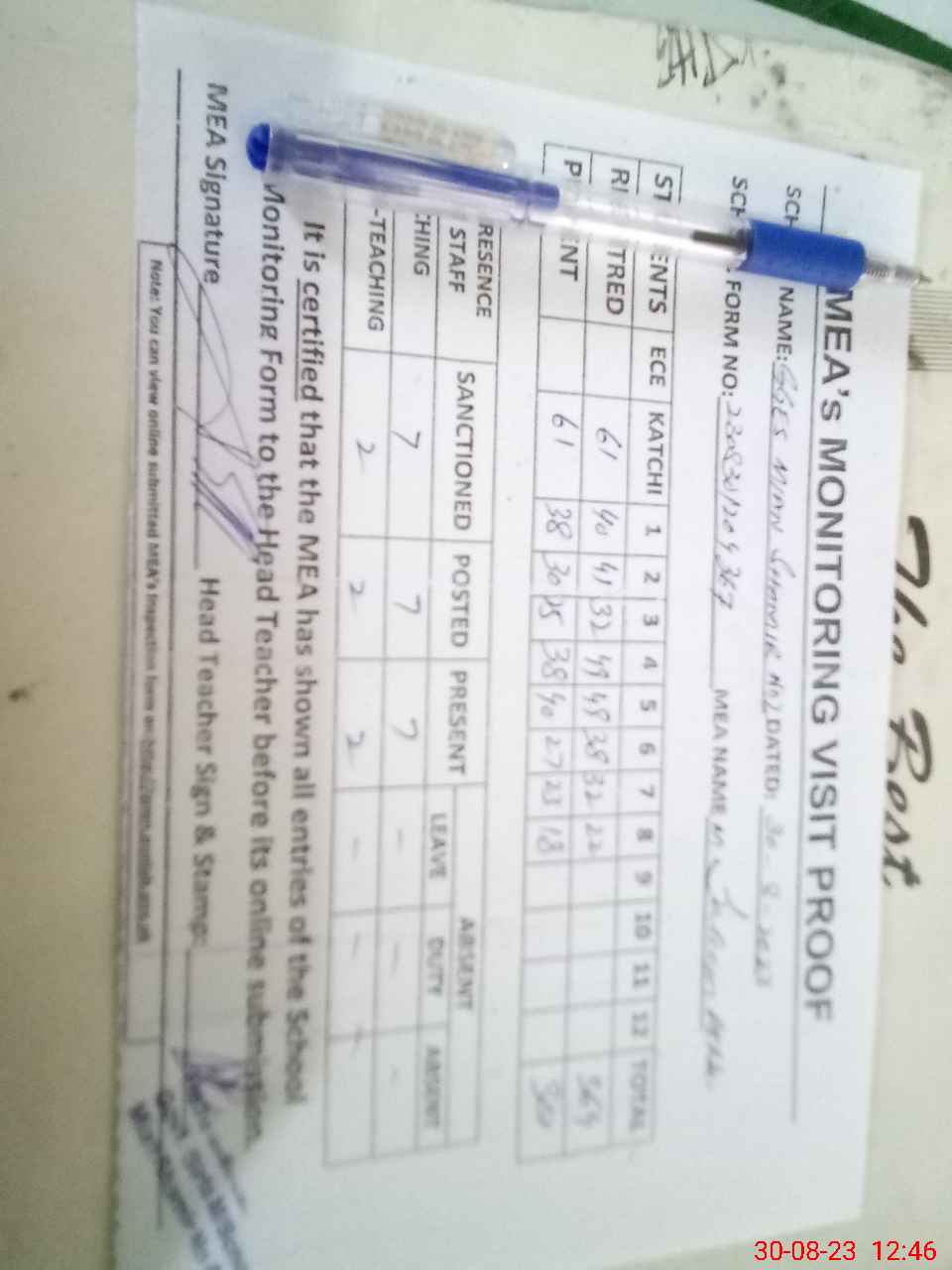| Attendance Register | Head Teacher | MEA with School | Visit Proof |
