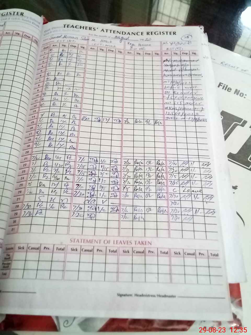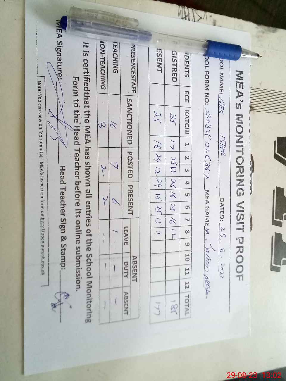 | Attendance Register | Head Teacher | MEA with School | Visit Proof |