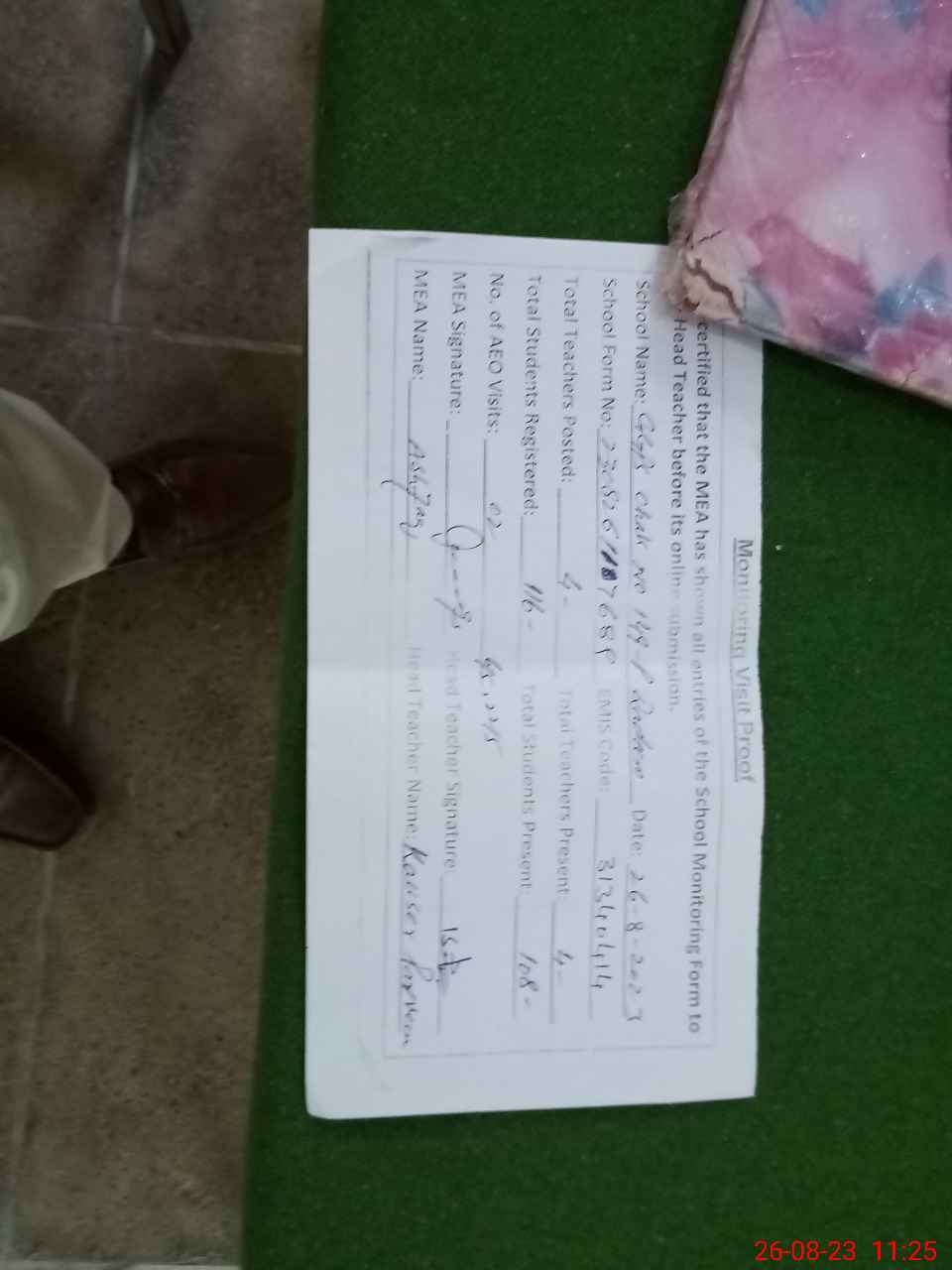 | Attendance Register | Head Teacher | MEA with School | Visit Proof |