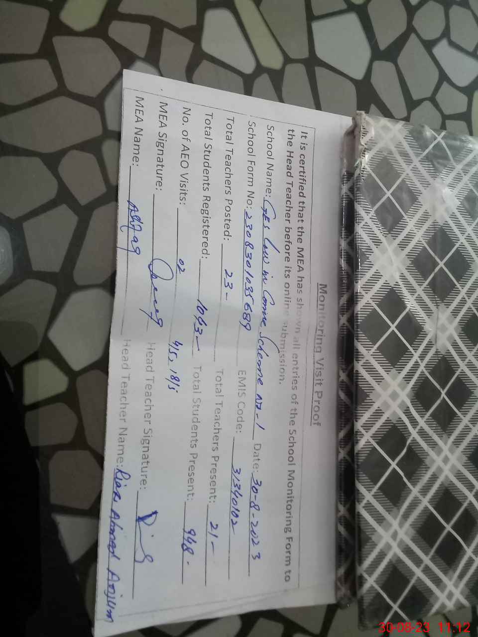 | Attendance Register | Head Teacher | MEA with School | Visit Proof |