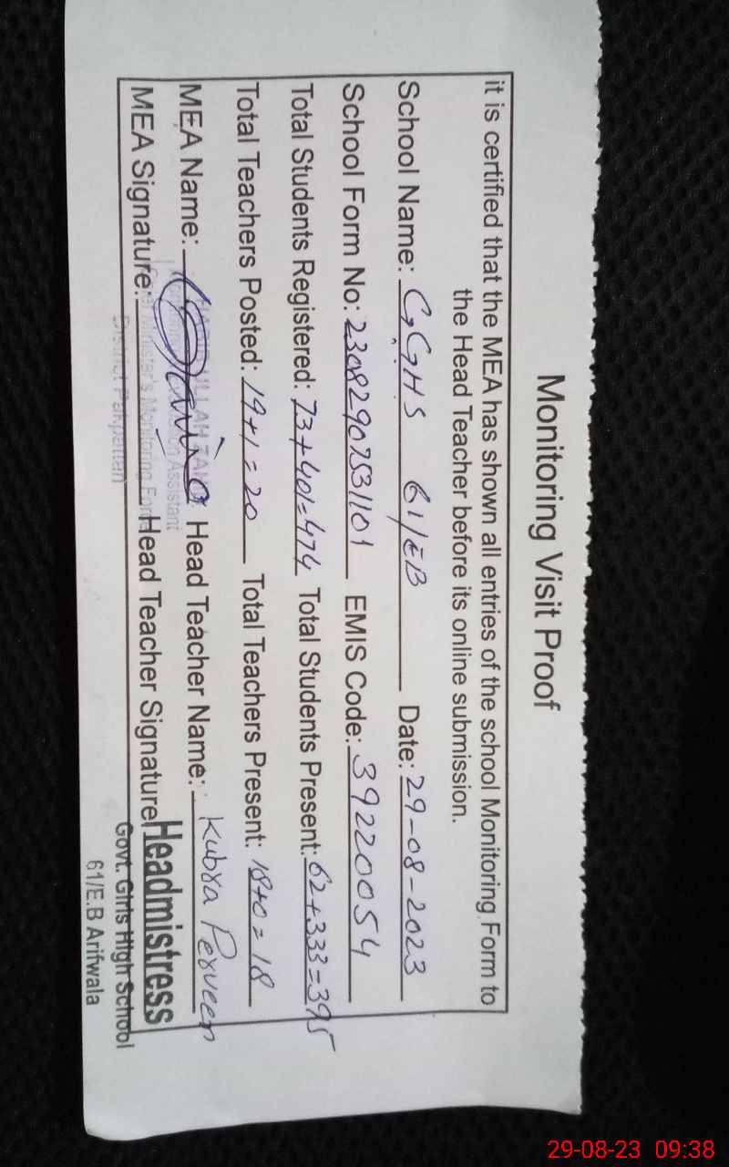 | EMIS Code: 39220054 | Name of School: GGHS 61 EB | |||