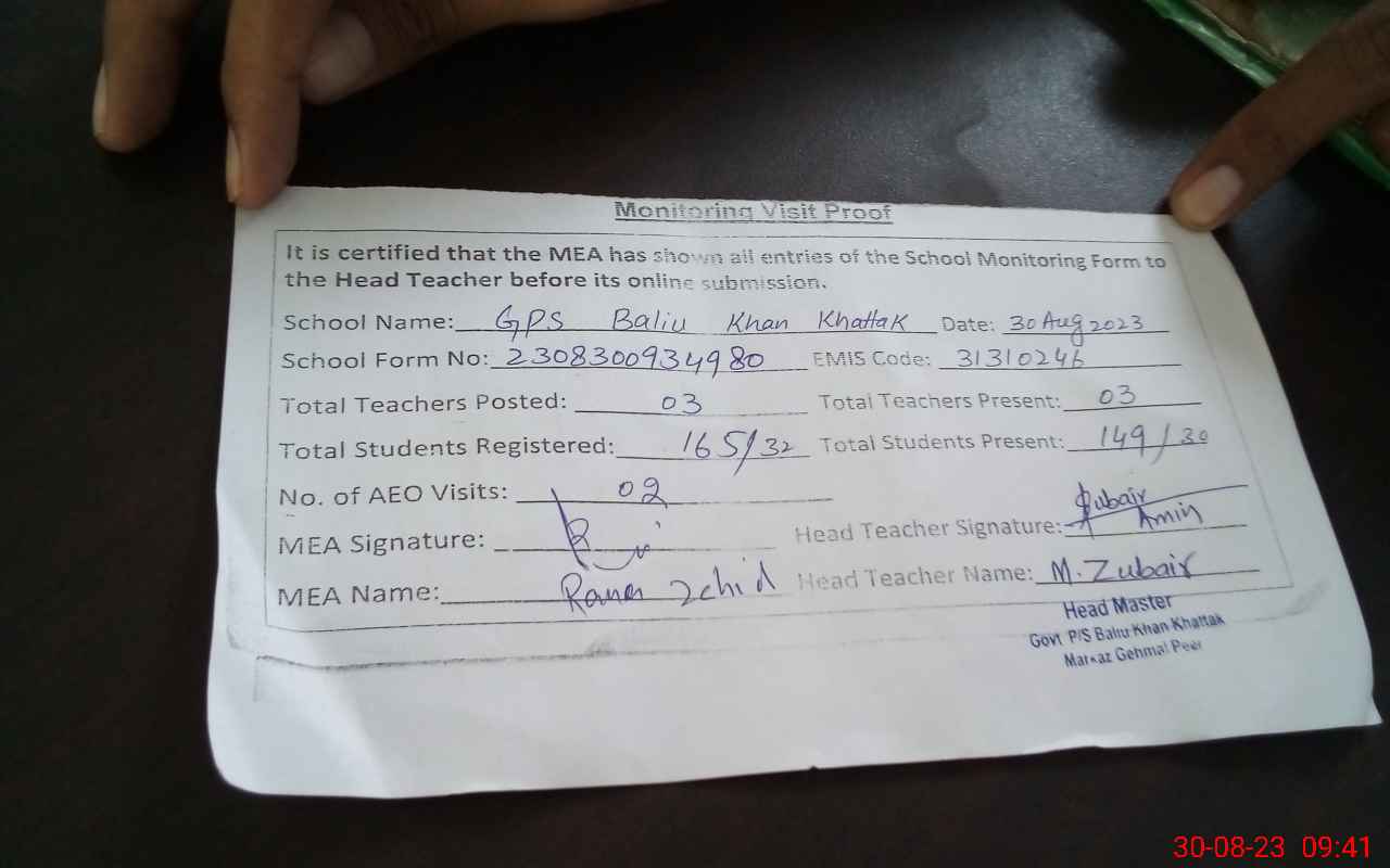 | EMIS Code: 31310246 | Name of School: GPS BALIU KHAN KHATAK (After Noon) | |||